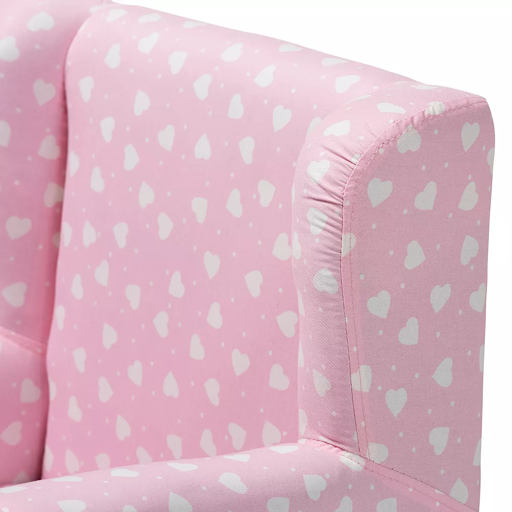 - Upholstered in pink and white heart patterned fabric