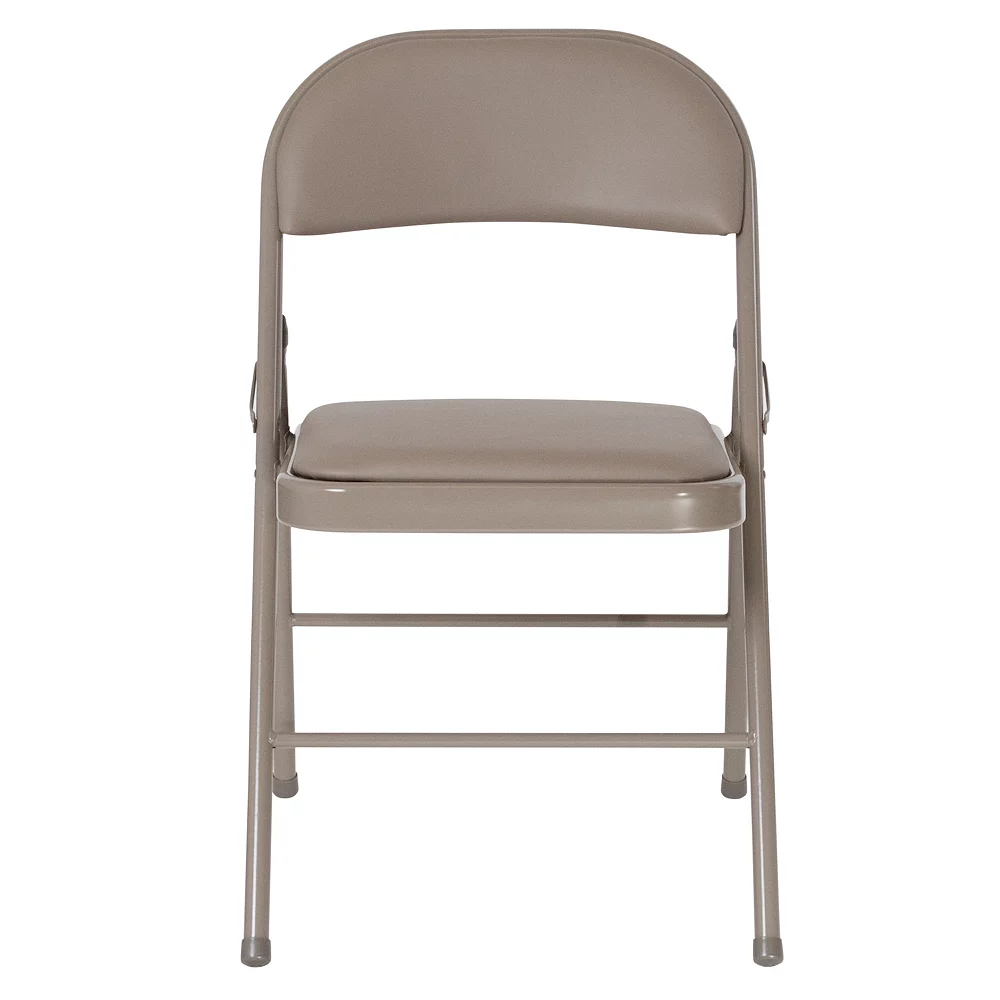 When your guest brings a surprise plus one handle the situation with ease by pulling out this classic metal folding chair with vinyl upholstery. This folding chair is built for everyday or occasional use in your business or home. The padded folding chair is upholstered in beige vinyl that is easy to clean and coordinates seamlessly with the frame. Its 18-gauge curved steel frame is double braced with legsupport bars to hold up to 600 pounds static weight capacity while the non-marring floor glides protect your flooring from scuffs and scrapes. These portable folding chairs fold compactly to transport and store. Don’t stay confined inside, take your social event outdoors and enjoy the weather, protect the frame from extreme moisture by storing indoors. These attractive chairs are a smart seating solution for your next business meeting or special event. With nothing to assemble these chairs come ready to service your needs.
