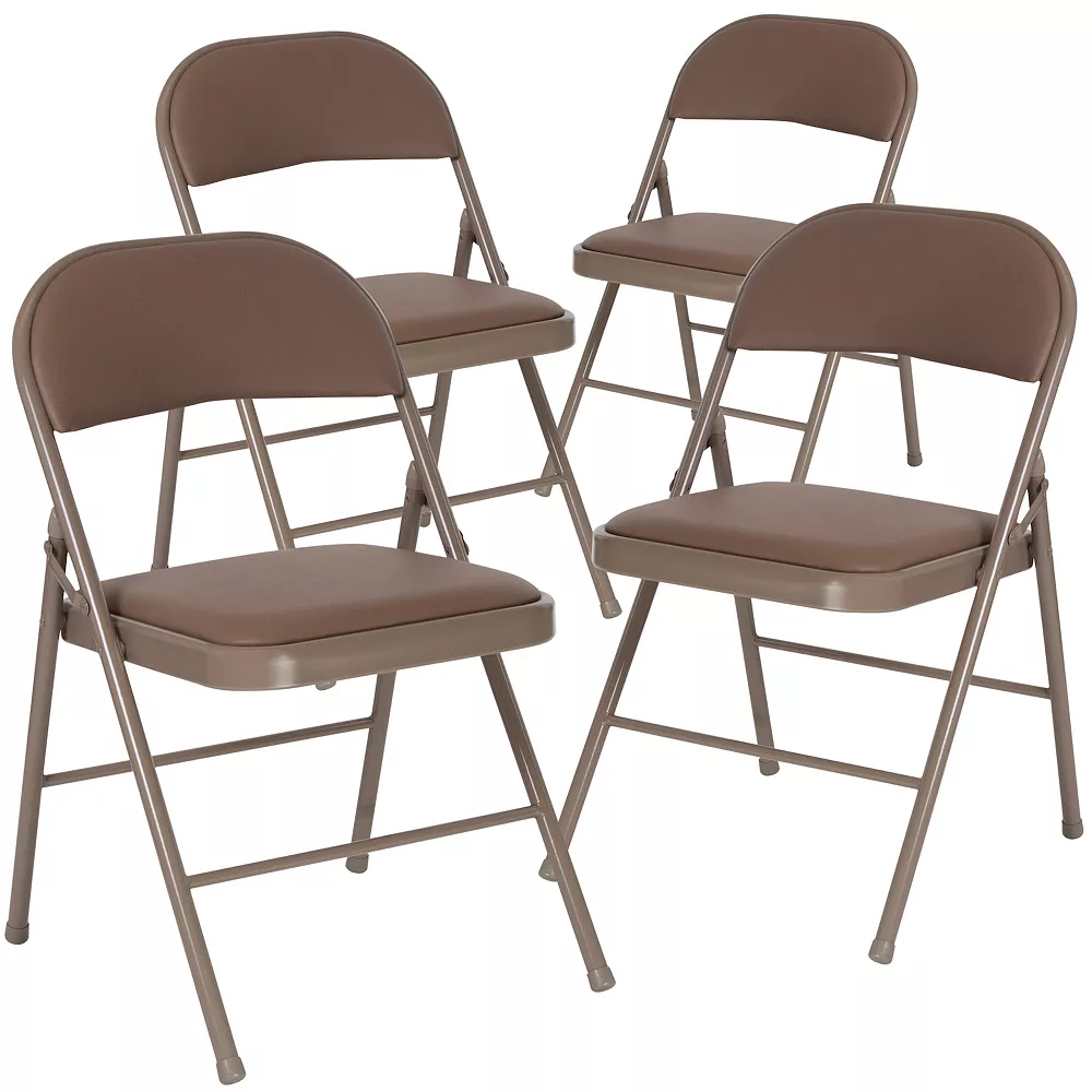 When your guest brings a surprise plus one handle the situation with ease by pulling out this classic metal folding chair with vinyl upholstery. This folding chair is built for everyday or occasional use in your business or home. The padded folding chair is upholstered in beige vinyl that is easy to clean and coordinates seamlessly with the frame. Its 18-gauge curved steel frame is double braced with legsupport bars to hold up to 600 pounds static weight capacity while the non-marring floor glides protect your flooring from scuffs and scrapes. These portable folding chairs fold compactly to transport and store. Don’t stay confined inside, take your social event outdoors and enjoy the weather, protect the frame from extreme moisture by storing indoors. These attractive chairs are a smart seating solution for your next business meeting or special event. With nothing to assemble these chairs come ready to service your needs.