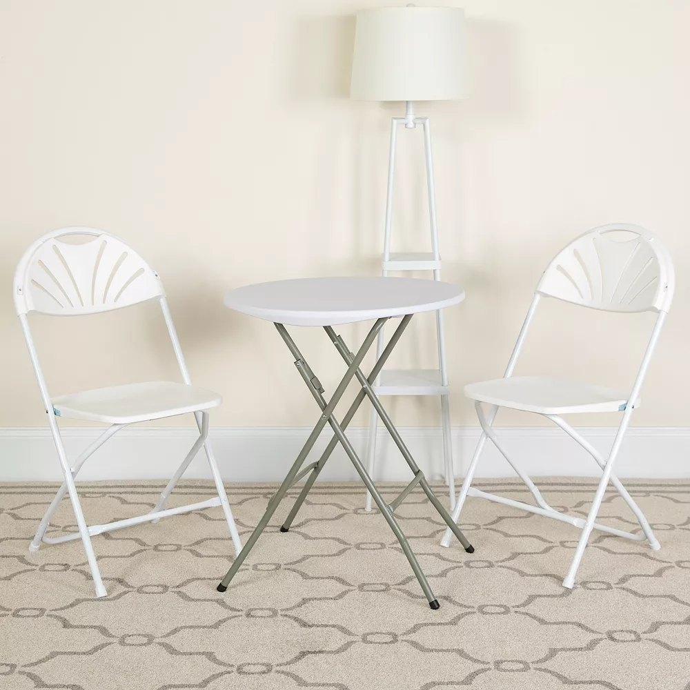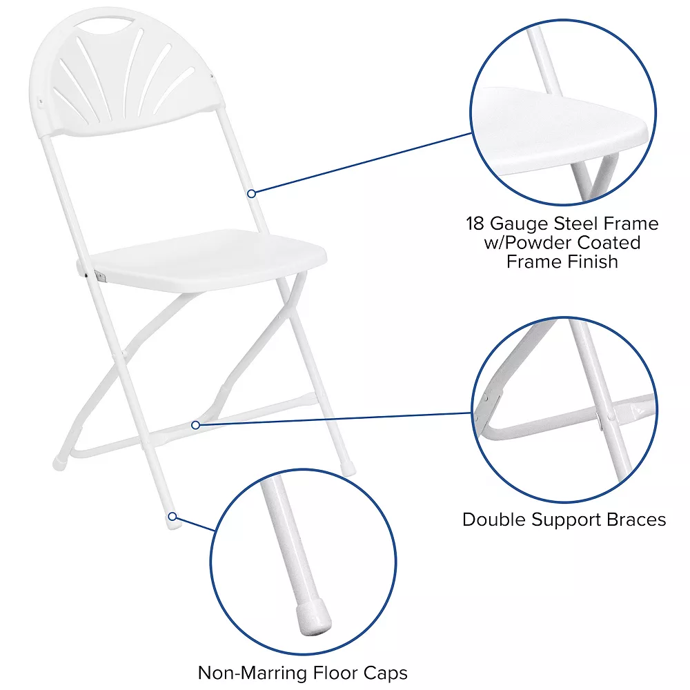 Imagine getting to setup these gorgeous fan back plastic folding chairs outside your venue where wedding ceremonies are held on sunny days as guests sit excitedly awaiting the arrival of the bride. Plastic folding chairs offer an easy seating solution for formal and informal events. Plan high tea, weddings, baby showers, and social events for clients. Folding chairs are more than ideal for the home to accommodate additional people during dinner parties, holidays, game nights, barbecues and book clubs. Their foldable design allows you to store them in your hall closet, garage or underneath furniture if you’re tight on space. With an 18-gauge steel frame built to hold up to 650 pounds you’ll have no problem seating all guests. Although designed for indoor use these foldable chairs have drain holes in the seat to prevent water from pooling during outdoor affairs and the textured seating surface is easy to clean after the most hectic events. Have your facilities manager stock plenty of these popular party chairs. After events these folding chairs stack on top of each other for compact storage, pair with a dolly to transfer between locations or keep them stored on the dolly.