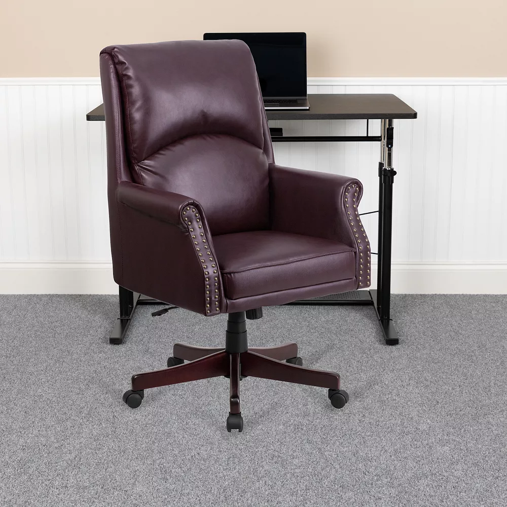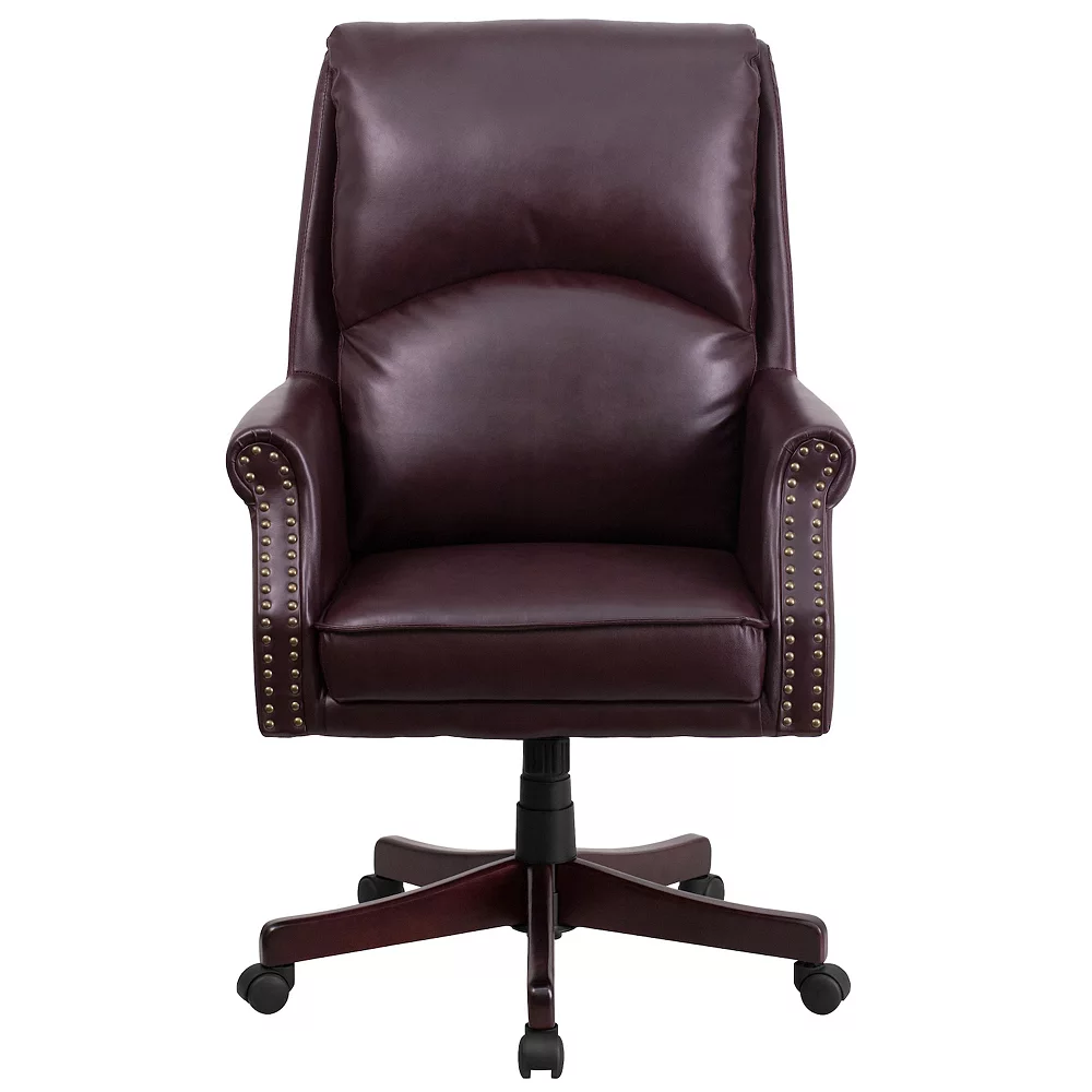 This luxurious traditional chair features soft Burgundy LeatherSoft upholstery and brass nail accents that trim the rolled arms. Having the support of an ergonomic office chair may help promote good posture and reduce future back problems or pain. High back office chairs have backs extending to the upper back for greater support. The high back design relieves tension in the lower back, preventing long term strain. The plush pillow back cushion provides excellent support, allowing your back to rest comfortably. Chair easily swivels 360 degrees to get the maximum use of your workspace without strain. The pneumatic adjustment lever will allow you to easily adjust the seat to your desired height. The mahogany wood base adds to the charm of a traditional appearance.