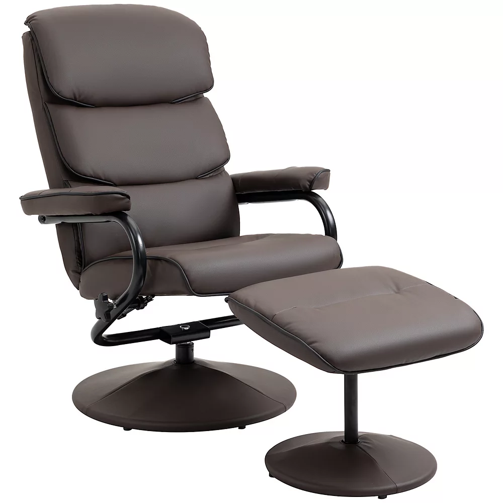 Bring supreme comfort into your home and office with this recliner and an ottoman duo from HOMCOM. This armchair has a metal frame and a wide-fitting seat design with a high slanted back for posture support, all-over padding for prolonged comfort, curved armrests, and PU leather. Take advantage of the 135 recline angle to stretch out your back, and the padded ottoman takes the pressure off your lower back so you can get into full relaxation mode.