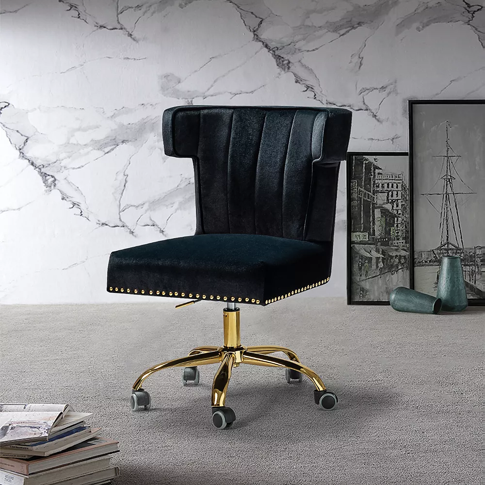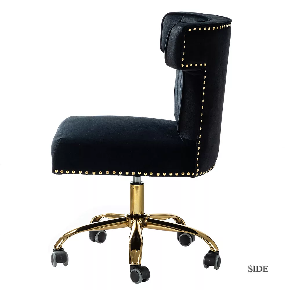 A well-edited workspace calls for a carefully-curated chair – and this design is it! It offers supreme comfort thanks to its ergonomic shape and features a durable frame with soft filling. No limits, no narrows, no uncomfortable causing by armrests.This 360 degree swivel, armless office chair allow you easier to raise or lower the seat.The bright and colorful finish will blend with most color palettes. Its classic design along with wingback and gleaming nailhead trim makes this chair a must-have in your home office. Durable gold finish metal five-pronged base and high performance all directional wheels allow smooth movement across carpeting. This chic design is height-adjustable to personally tailor your space.