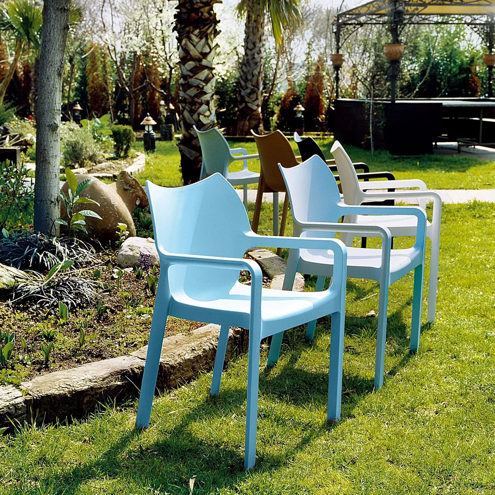 This outdoor dining armchair in light blue hues has a minimalist modern style and will add elegant sophistication to its surroundings. It is made from commercial-grade resin and is sturdy enough to brave all weathers. Wider than most chairs it will not fly away in the wind. Easy to maintain and resistant to UV salt oils and stains it will make your patio parties and garden gatherings a memorable affair. Material(s): polypropylene/resin